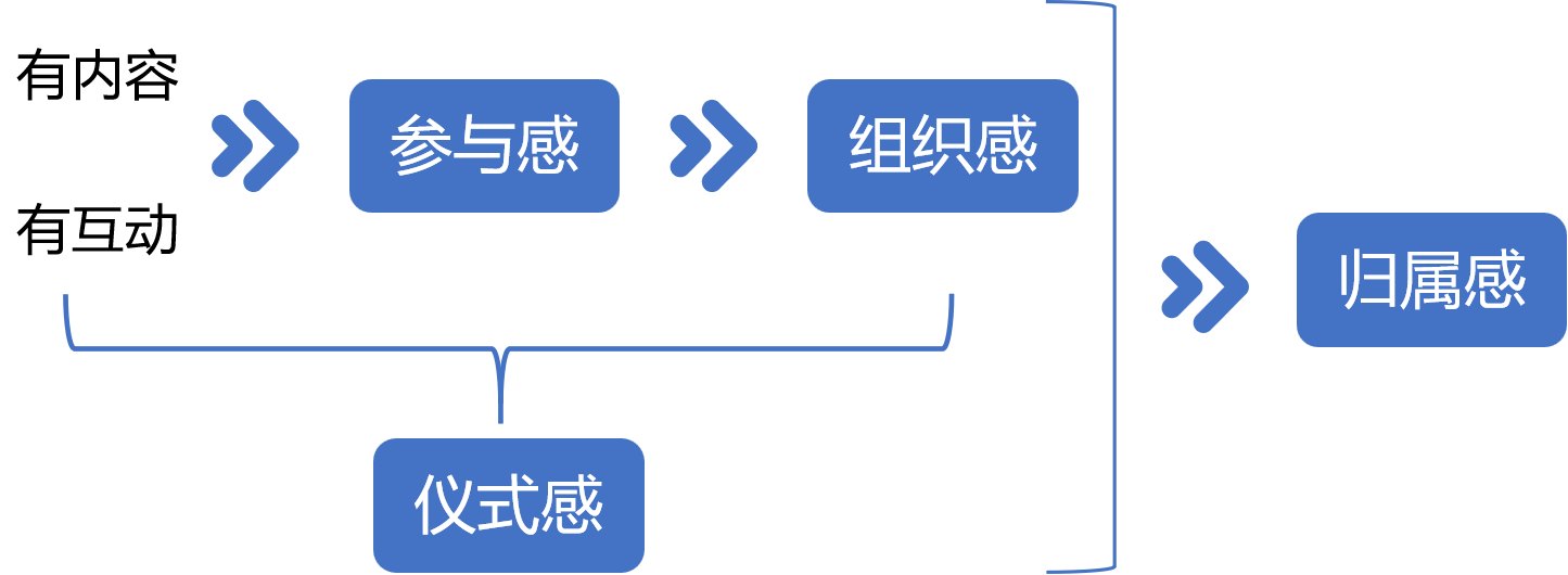我们创建社群,首先需要确保有内容、有互动,这样才可以激发用户的参与感。而最好的参与感,是通过策划话题、活动等内容,来培养、激发用户的组织感。而这整个过程都有仪式感来作为支撑,而最终目的是实现用户获得归属感。