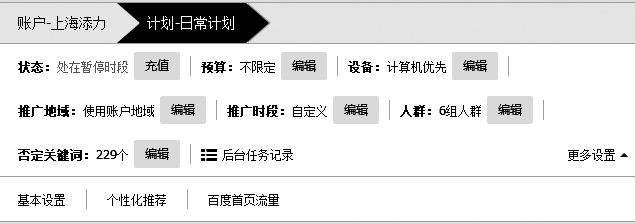 讲完账户层级的基本功能与设置,我们接着来看一下它的子级——推广计划,点击左侧某一推广计划,在右侧也有计划层级的功能和设置,如图3-21所示。