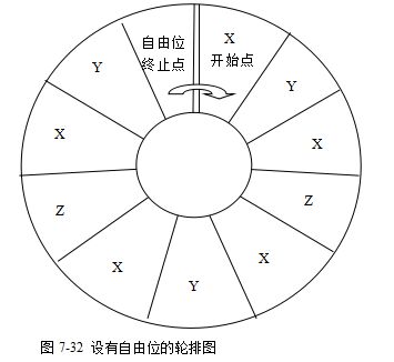在品种X:Y:Z以 50%:30%:20%的比例进行生产时,在同一条流水线上可以使用图7-31所示的轮排图进行生产排程。这样的排程是理论上可行的,但在实际生产时,可能会发生延迟的情况,所以很呆板地按照这样的方式进行生产的话,一天未必能生产出100个。为了增加生产排程的灵活性,可以考虑设置“自由位”。所谓自由位,就是没有指定产品的含义。例如,在轮排表上增加1~2格,视情况安排1~2个调整位(图7-32)。