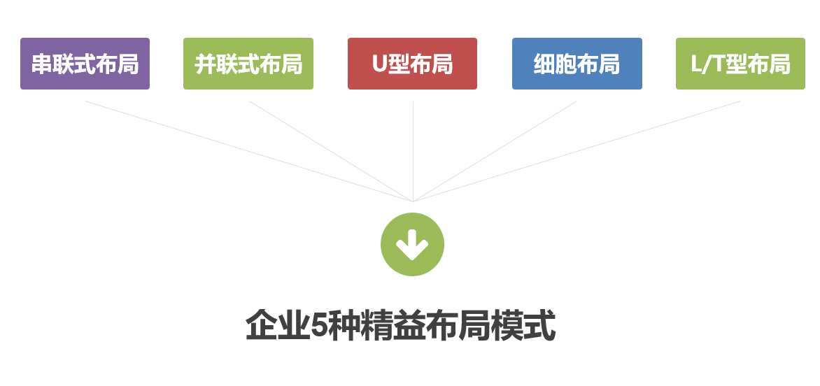 精益布局的应用方法主要抓住“单件流”这一精益化的核心思想。图5-3、图5-4为精益布局模式和示意图。