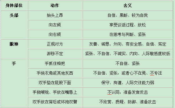首先对应聘者头部、眼神、手、腿脚与坐姿等综合表现进行联系性分析,要从一个立体面上看人,而非仅从一个点割裂看人。
