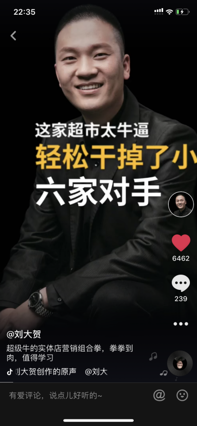 笔者有一个抖音视频,分享的是笔者家楼下小区超市的营销案例,点赞量只有6485人,而一个南京的公司人员转发了这个视频,点赞量竟然突破141万。这个账号原先粉丝只有不到一万人,结果一晚上粉丝增加了25.9万。这就是原创不火的经典案例(图2-17),对方只是把背景换了一下,声音和内容全是笔者的,竟然“也算原创”了。所以,对于抖音的原创,大家要有更直观的认识。别怕模仿和复制,关键是要有创新元素。