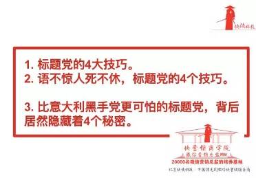 如果在学校讲课,我一般会讲标题的四大技巧。这是最精简、最简单的表达,比较直白。但是后来我想,既然讲标题党,这个标题也太庸俗、平庸了,没有煽动力。所以我又改了一个标题:语不惊人死不休,标题党的4个技巧!语不惊人死不休,就是标题党的最核心原理,通过博眼球去获得关注,获取流量。但是我们也发现,在微信里,我们看到很多文章,写的比较像第三句:比黑手党更可怕的标题党,背后居然隐藏着4个秘密?那么是不是这样的句子更有煽动力,因为它更具有故事性。标题党和黑手党连在一起,背后居然有四个秘密,它是不是讲了一种故事。一般来讲,第三种阅读打开率要高一些。