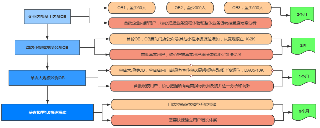 单店大规模公测OB。2周后的业态趋于平稳,接下来需要灌入更多的流量开始规模性OB,将已经在OB和CB阶段的策略复制,并在门店开始增设广告标牌、宣传位、促销员口头宣传、线上公众号、扫码购等资源。为期1个月,1个月后开始进行单店OB复盘。