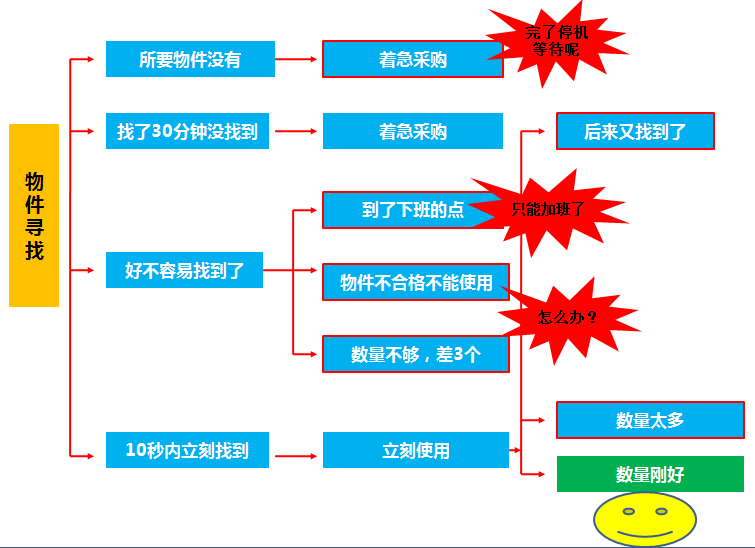 导致浪费:生产线停机等待的浪费、员工寻找物件的时间浪费、生产计划变更的浪费,最终导致交货期延迟,不能满足客户需求。