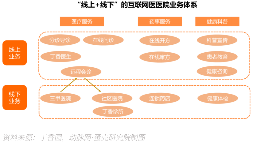 线上诊疗必须依托线下实体医疗机构,电子处方也必须依托线下药店才能完成药品供应。互联网医院通过依托丁香诊所、社区医院建立会诊场所,实现远程会诊;通过连锁药房,承接电子处方,完成药品配送,切实解决患者的医疗诉求。