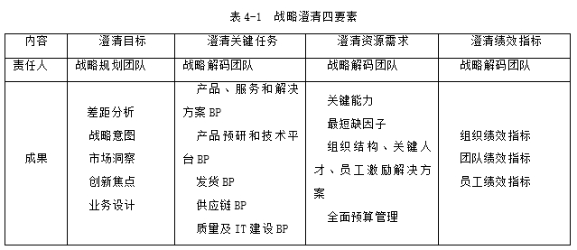 对于中小型企业,我们发现在战略解码阶段,只要做好了4件事情的澄清,即澄清目标、澄清关键任务、澄清资源需求、澄清绩效指标,一样可以实现战略、战术、战斗的统一性。表4-1给出的四要素澄清虽然简单,但精准而有力量。毕竟管理不需要花架子,应该根据企业的现状采取适合的管理手段,持续于管理改进。