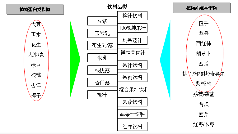植物饮料大品类可以分为植物蛋白饮料与植物纤维饮料两大基本类别,这两个类别饮料分别以相应的植物类作物为原料,都是植物饮料品类极有前景的品类。