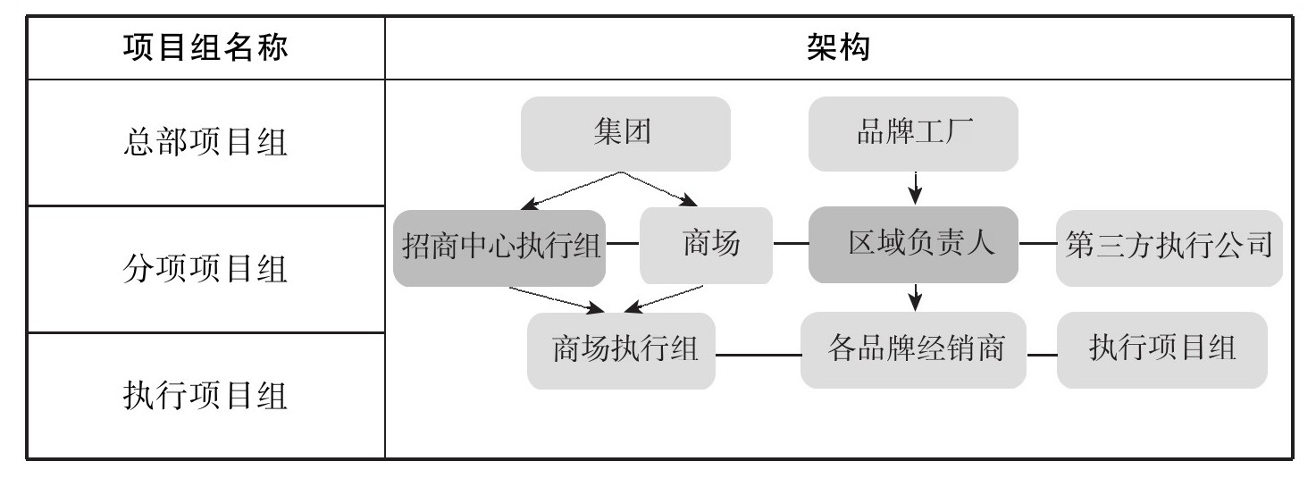 分项项目组:总部、商场、第三方执行公司、品牌区域负责人形成项目组,共同管理品牌经销商落地执行;