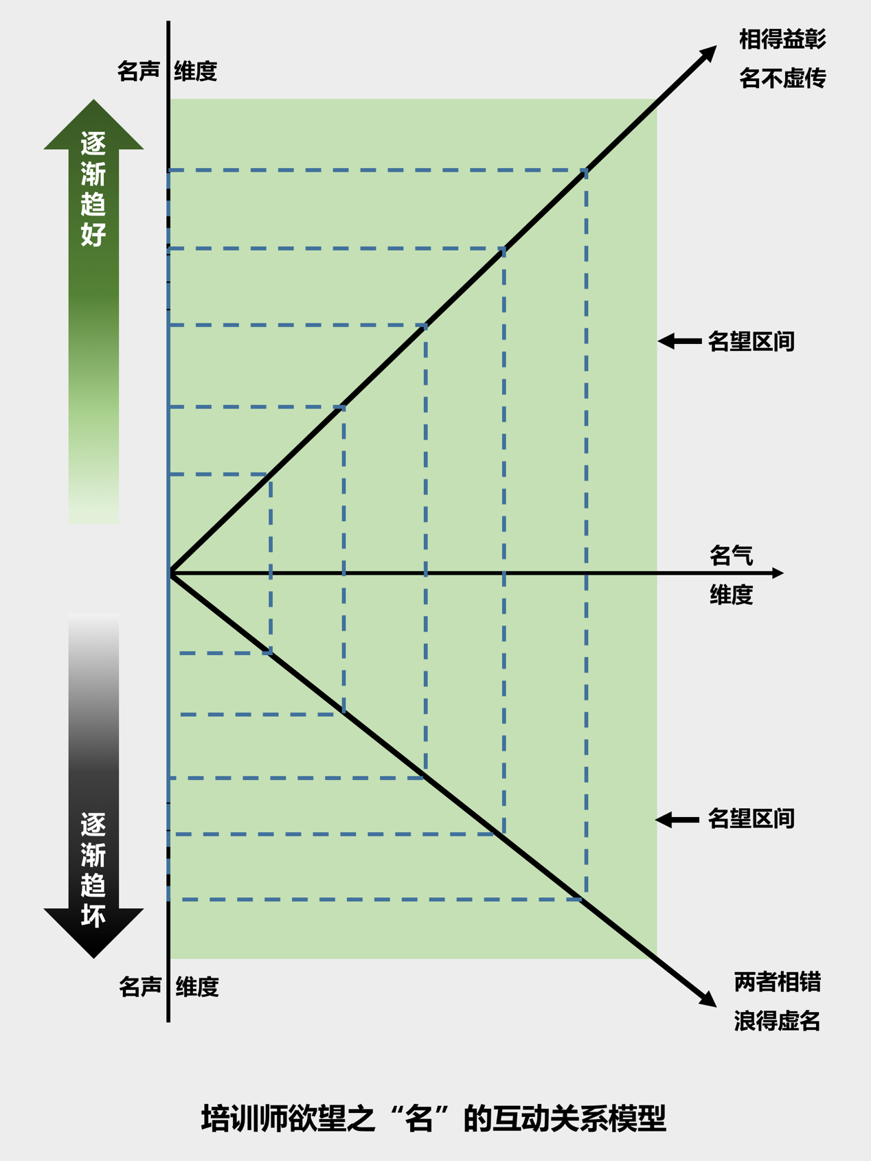 从职业实践的现实情形来看,培训师个人的利益一般都是在名的基础上逐步获得。如果能够好好把握“名气”和“名声”两个基本维度之间良好的互动关系,利益将会呈现正向增长的态势。反之,利益的增长就可能停滞,甚至下降(或者减损)。