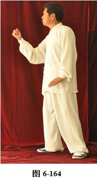 接上式,松腰,右腰向左提转,身体向左微转,右掌跟随向左挥出,重心移向左腿;随即腰下沉回拱,右掌心向下沿胸前抽回, 向右外正西打肘,重心移向右腿;左腰向右提转,身体向右微转,左掌向右正西挥出,重心落于右腿;腰回拱向正东转,左掌心向下沿胸前抽回,向左外正东打肘,重心移落左腿;腰下沉,提右腰向右外旋转,随即右脚提起,向右后侧迈开一步,身体随腰向右转, 面向正西。同时右手掌变松握拳,随转体向右外撇捶抽回右肋旁; 左腰上提,左手掌随腰抬起向正西推出,掌心向外。左脚随之内扣, 脚尖稍向西南。腰后拱,左掌随即回抽胸前,落于右拳腕部,腰右外旋转上提,右拳自右肋起,向右上方划弧打出一拳,高与右额齐, 拳眼朝向左里侧。腰向左后微拱,左掌带着右拳沿右侧向左侧慢慢回抽, 随抽右拳展开慢慢变掌,重心随之慢慢落于左腿,成左下捋(见图6-160至6-164)。