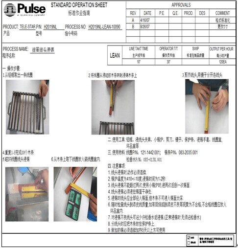 在对各工序作业现场调查分析的基础上,将现行作业方法的每个操作程序和动作进行分解,标注操作要素(比如,作业步骤、作业时间、节拍时间、标准产出、标准在制品数量等),形成的指导性文件就是标准作业指导书。标准作业指导书展示在操作现场,要简单明了、图文并茂、易学易懂,达到安全、准确、高效、省力的管理效果。