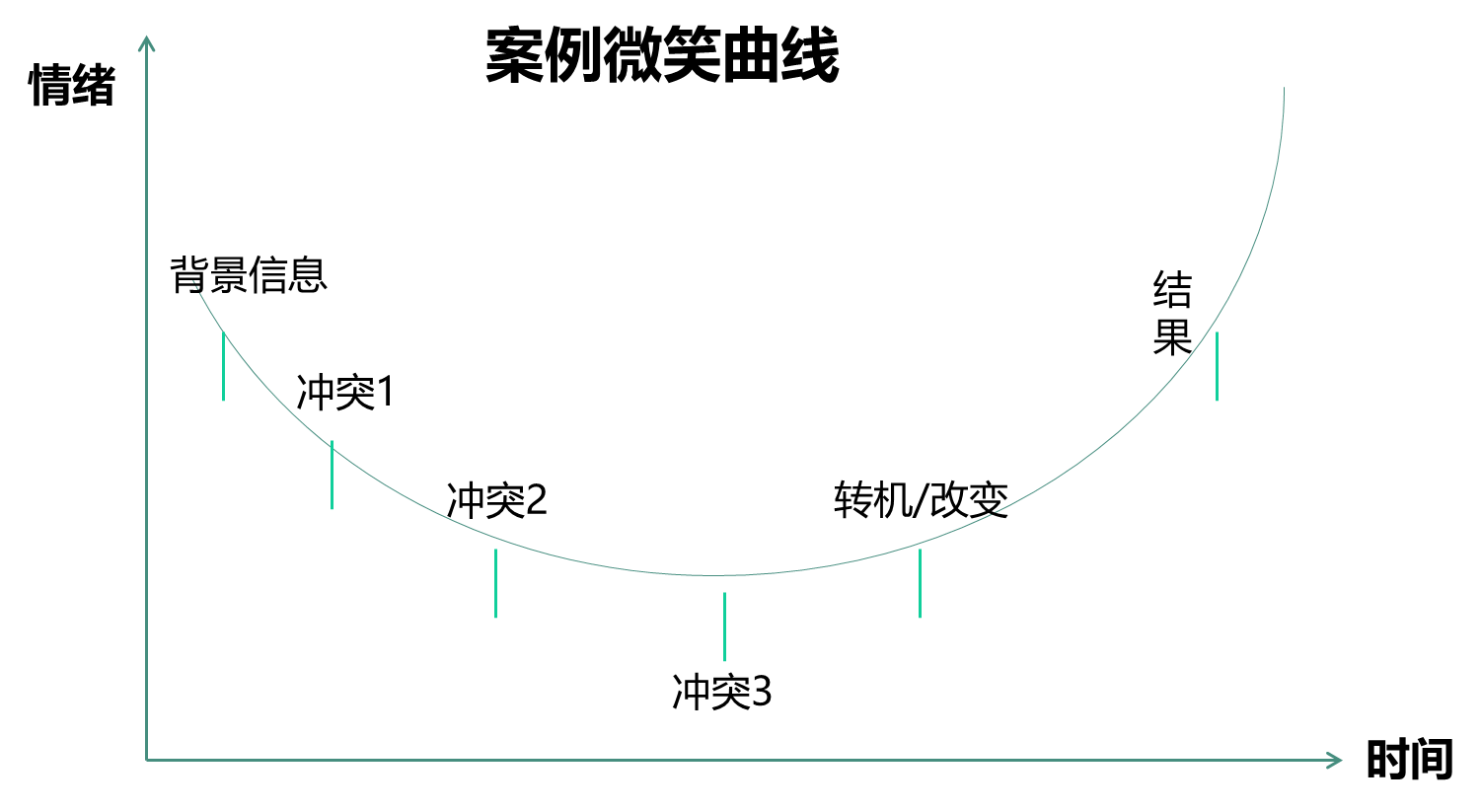 一个案例的主体部分是由各种各样的情节组成,是案例中比较复杂的部分,为了更容易厘清案例情节的部分,这里给大家介绍一下微笑曲线工具。微笑曲线在编故事或艺术演绎时能够非常好地进行设计和规划,而在案例编制时,我们可以借鉴其方法对过去发生的事情进行梳理。