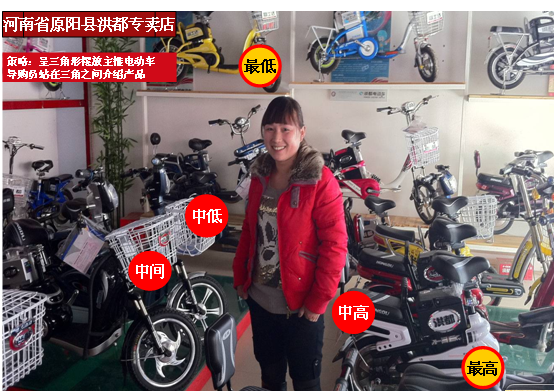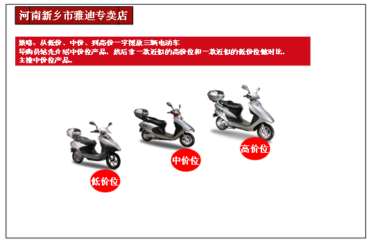 从低价、中价、到高价一字摆放三辆电动车,导购员先介绍中价位产品,然后拿一款近似的高价位和一款近似的低价位做对比,主推中价位产品。他的销售方法是“对比法”。电动车价格高高在哪里,价格低低在哪里,给你讲的一清二楚。雅迪在新乡市销售数一数二,人家经销商、店长也下过不少功夫。