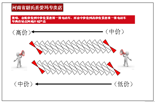 由低价位到中价位紧密排一排电动车,再由中价位到高价位紧密排一排电动车,导购员只介绍两端的产品。导购员遇到高价位买主站左端介绍,遇到低价位买主站右端介绍,中间的电动车只是陪衬,基本上不坐介绍。爱玛这位店长多年前来自新日专卖店,在尉氏县电动车一条街是位有名的销售高手。他的策略就是区分出产品的不同之处,让顾客明白一分价钱一分货。