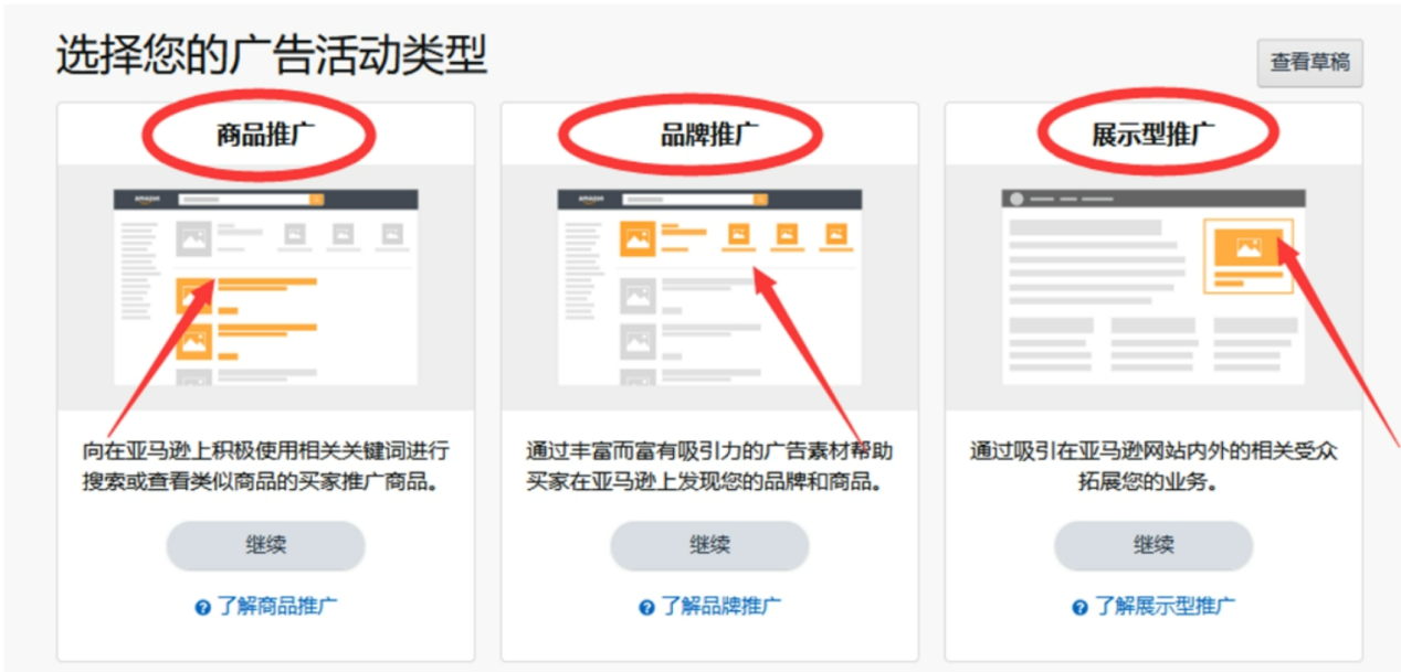 在亚马逊后台创建 CPC 广告活动时,有商品推广、品牌推广、展示型推广这三种广告类型(如下图)。大量广告数据表明,这三种广告方式转化率递减,商品推广型 CPC 广告整体转化率最高,展示型推广最低。
