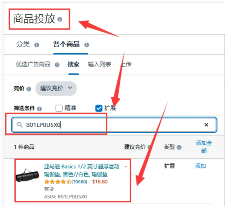 按商品手动投放广告时,卖家无需输入商品关键词,只需选定要投放广告的商品,亚马逊系统会按竞价等因素在竞品 Listing 中自动投放,卖家也可输入某些商品 ASIN,以特定商品为投放对象(如下图)。按关键词手动投放的广告展示位置通常在商品搜索结果页,按商品手动投放的广告展示位置通常在投放广告的商品详情页。