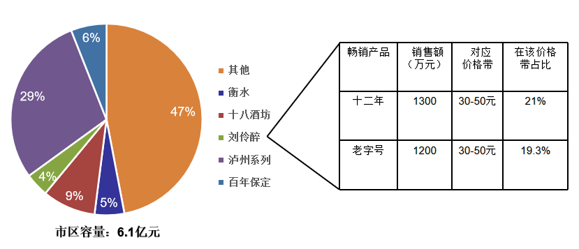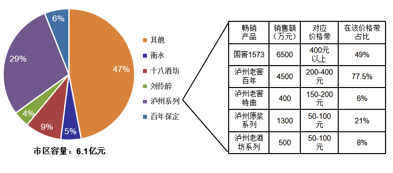 泸州老窖在保定的产品线分布从7~1000多元,在400元以上、200~400元、150~200元、100~150元、50~100元、20~50元等多个价格段上均有1~2款畅销产品。