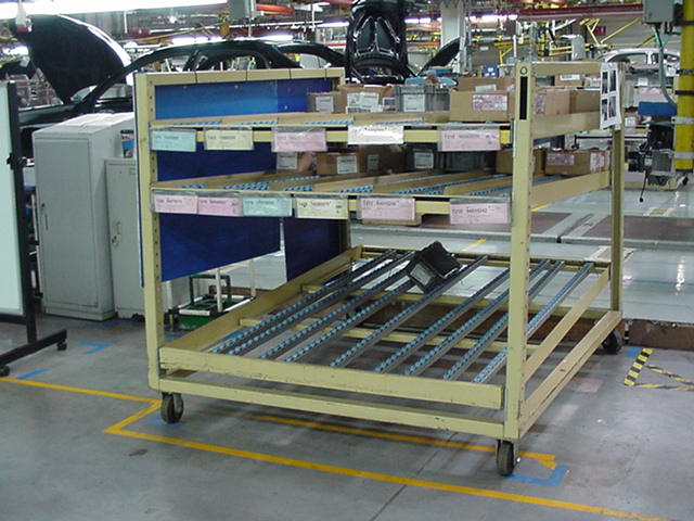 对汽车总装线来说,线旁物料空间永远是不足的,对于中小件是采用线旁的滑道料架的方式存放,每个物料号都有固定的存放位置,线旁一般存放3个小时的周转量。