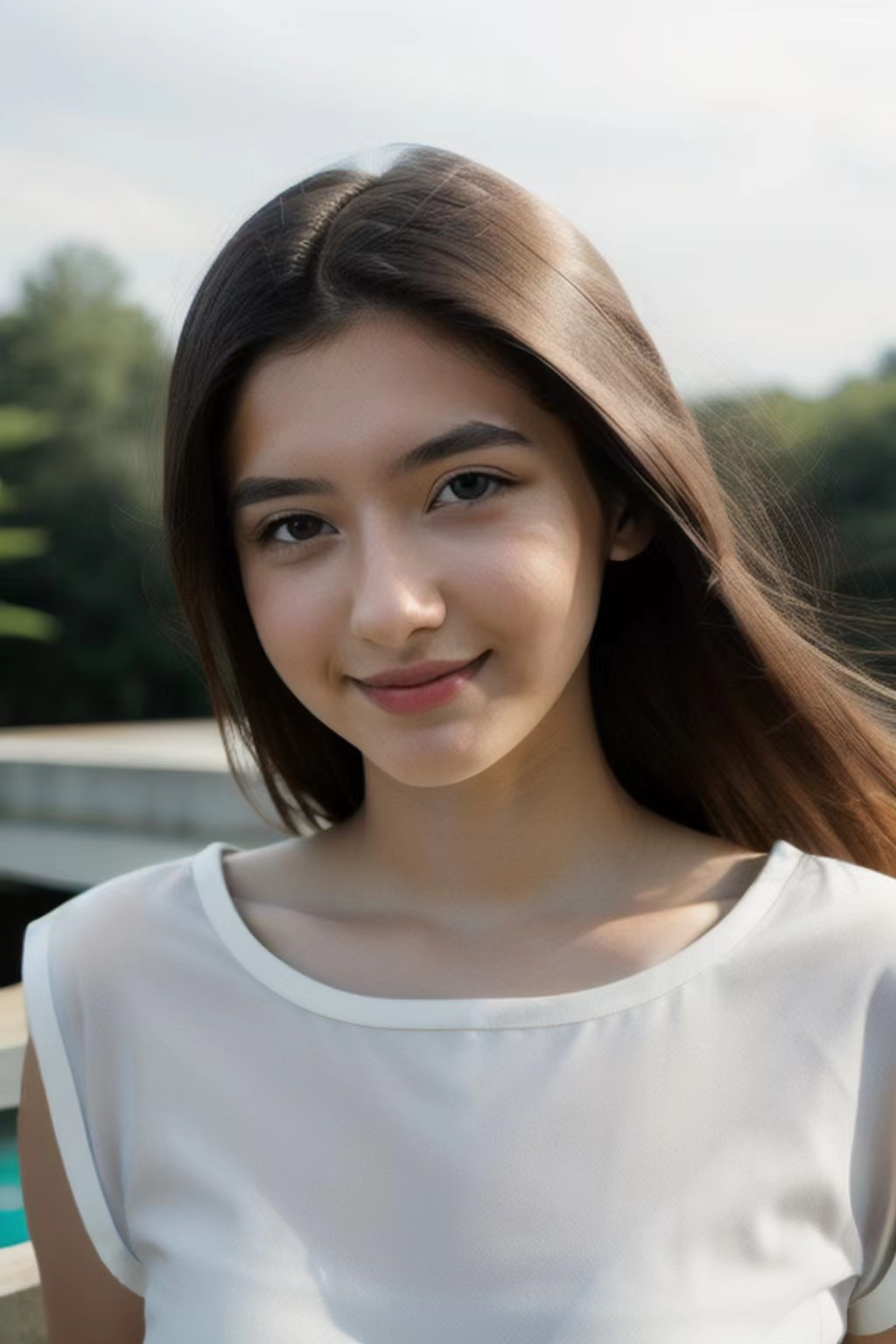 描述词(Prompt)是AI绘画的咒语,通过关键词或语句,描述想像的画面,引导AI按照您的创意作画。比如天空下的女孩肖像,对着镜头微笑,美丽的脸庞,穿着白色打底衫,有新疆血统,伦勃朗光线,毛孔质感,虚化背景森林,布满云彩的天空,电影,优雅,错综复杂,超详细,三分法则,专业照明,虚幻引擎,幻想,概念艺术,锐焦,插图,8K,得出的结果如图6.5所示。
