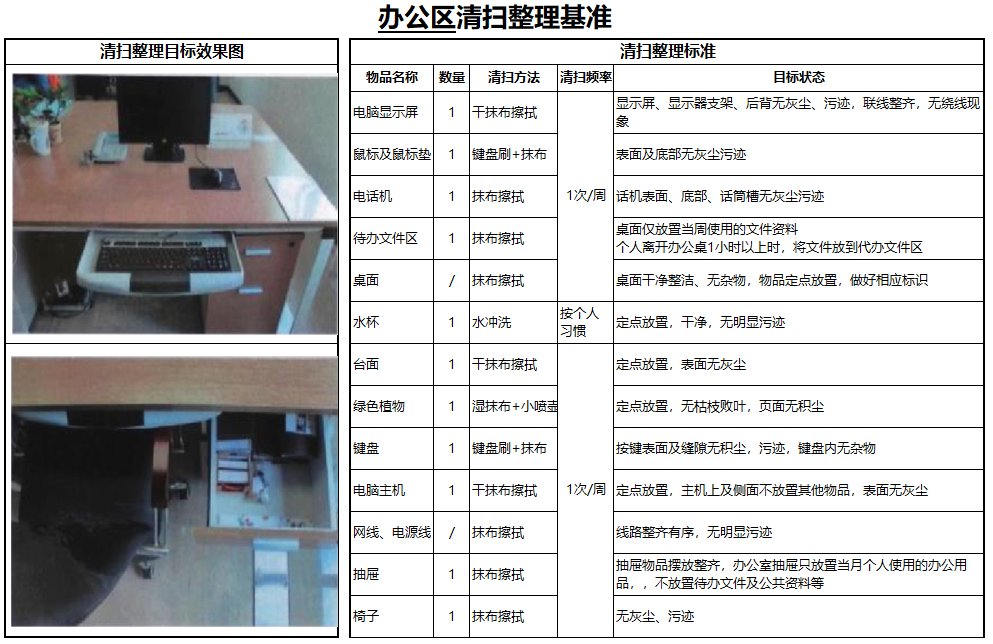 清扫:将岗位清扫到无垃圾、无灰尘、无脏污的干净状态,同时检点细小处。