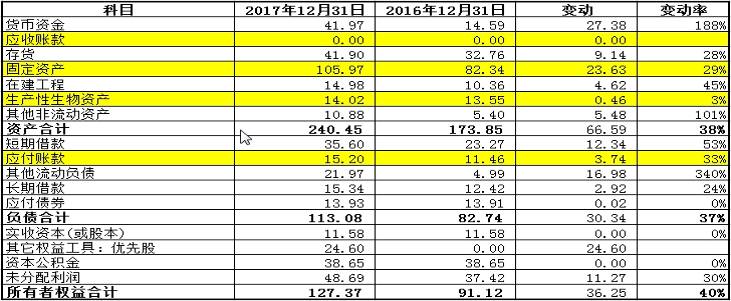 第一组:牧原股份(表1-9)和温氏股份(表1-10)。温氏股份作为最大的养猪企业,货币资金虽然只有6亿元,但是有30亿元的理财产品。这种对上下游议价能力如此强的企业,货币资金依然相对较少,原因是更多的资金都沉淀在固定资产投资和存货里了,这是农林牧渔企业的硬伤。此外,温氏股份的所有者权益大幅减少25.40亿元,可以看到是未分配利润的减少,即2017年度里温氏股份大幅分红了。对比牧原股份的资产负债表,牧原股份的所有者权益大幅增加36.25亿,这说明温氏股份扩张的决心远远不及牧原股份。