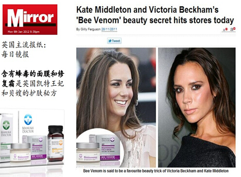历经百年风雨,H&B以过硬的产品质量和清新、健康的品牌形象,取得了英国皇室和社会名流的喜爱与信任,许多皇室成员都在使用H&B的产品,并口口相传。英国主流报纸《每日镜报》就曾报道含有蜂毒的H&B面膜和修复霜是凯特王妃和贝嫂的护肤秘方(如图3-2所示),英国皇室信任的百年品牌成了H&B强有力的背书,任何广告效果都无法比拟。这与习近平主席偕夫人彭丽媛穿国货出访、送国货化妆品为国礼,使大杨创世等服装品牌声名鹊起、百雀羚这个百年品牌产品脱销有异曲同工之妙。