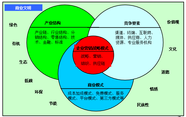 交集核心是企业的营销战略模式。这个模式是在商业文明的载体上,由产业结构、竞争要素、商业模式三个主客观要素群共同集合而成。如果这四个板块里的关键要素发生质变,就会导致产品灾变。