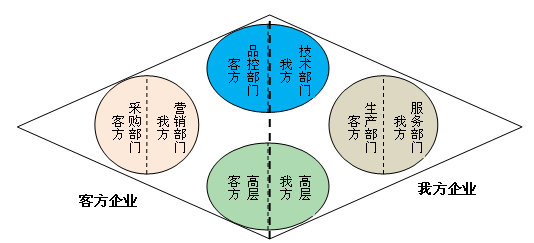 2010年,随着市场竞争的激烈,机械厂经营压力明显加大,决策者决定加大换热器设备市场的新产品开发与市场开发力度,由研发部、生产部与市场部抽调精干人员组成项目小组,进驻各重点大客户企业,与企业的相关人员一起分析设备需求,共同研发、共同试产。几年来,机械厂通过深入的调研与产品的个性化定制,满足了重点客户的价值需求,机械厂也获得持续发展。在这个阶段,机械厂与重点客户之间构成了菱形客户界面关系。