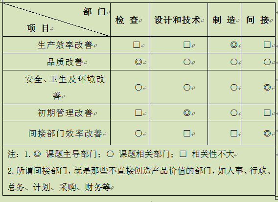 由于这些改善课题通常又都是跨部门存在的,如表4-10所示,就是焦点改善活动课题与各职能部门之间的相关关系。
