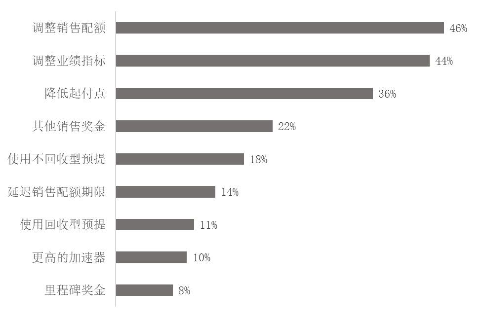 短期来说,管理层必须将照顾销售人员作为头等大事。如果销售目标无法实现,那么潜在的激励薪酬就会被销售人员视为虚假的承诺。企业需要随着外部环境的变化,灵活敏捷地调整当前的销售薪酬激励计划,保障销售人员的个人现金流。同时,企业需要强化沟通,坦诚地告知销售人员外部问题对企业造成的具体损害,以及销售人员如何分担业务受到的影响?销售薪酬激励计划是否会进行调整?如何调整?以下是一些企业可以考虑的,针对销售薪酬激励计划的短期调整措施: