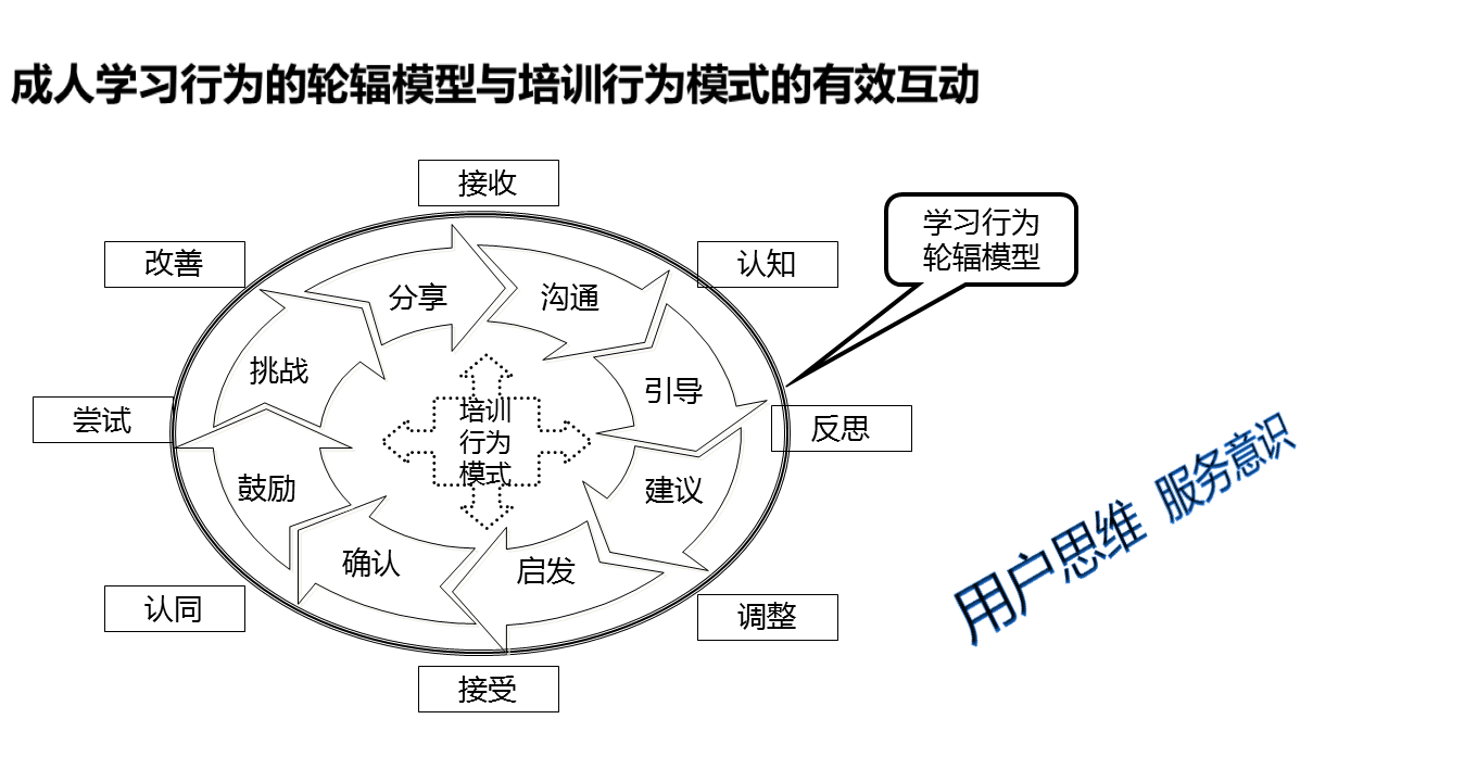 简单来说,成人学员的学习行为一般会经过这样轮转过程:“接收-认知-反思-调整-接受-认同-尝试-改善”。