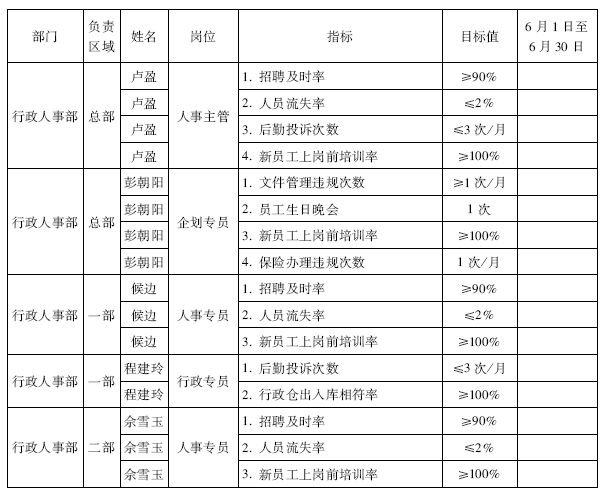 :对,比如人事行政部,考核人事主管的是一些总的数据,如招聘及时率、人员的流失率、新员工上岗前的培训率等,但这几个考核指标的达成跟下面人员的指标密切相关。