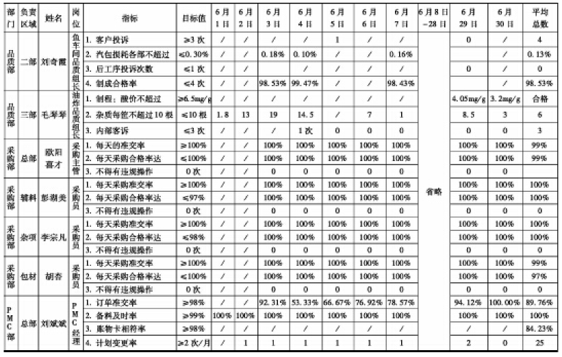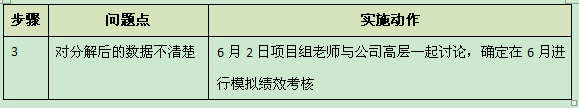 :针对不清楚分解后的数据问题,项目组老师在6月2日与公司高层一起讨论,确定6月进行模拟绩效考核。但这个绩效考核在6月并没有正式推行,我们只是每天统计数据,然后每周看一下各指标达成的情况怎么样,最后再确定一个合理的绩效指标。