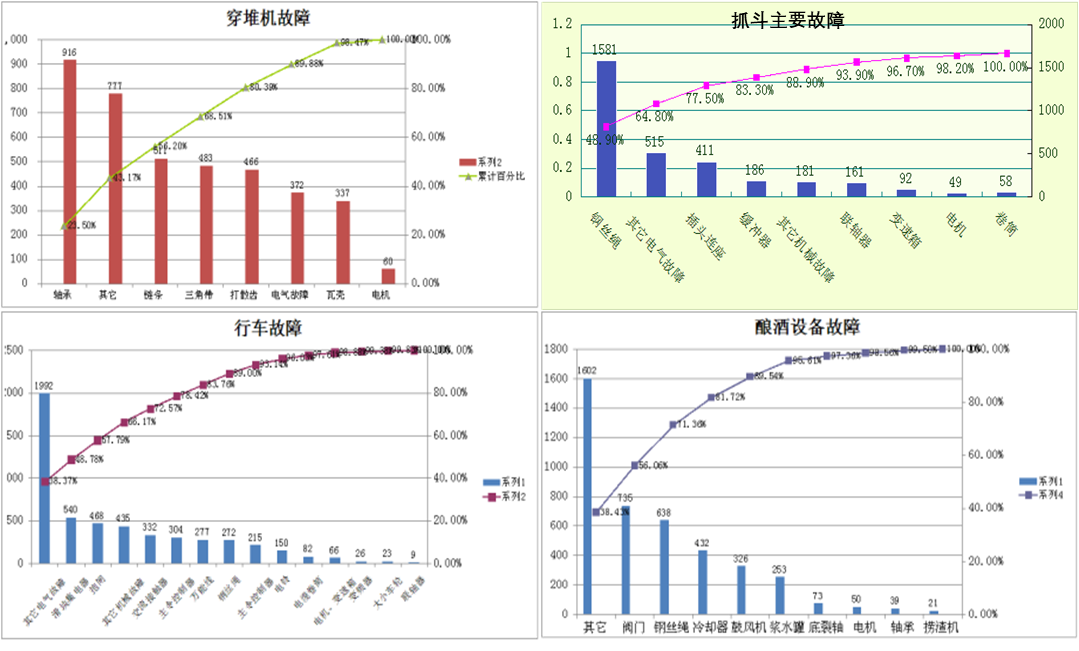 设备故障数据库建立后,现场管理者需要对当前主要故障、各型设备存在的问题点、各零配件品质状况进行统计分析,并制定改善对策,保证设备正常运行。