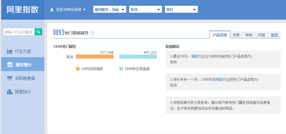 我们来看阿里指数里面的属性细分,得出:30天耳钉行业类别为耳饰。如图1-5所示。