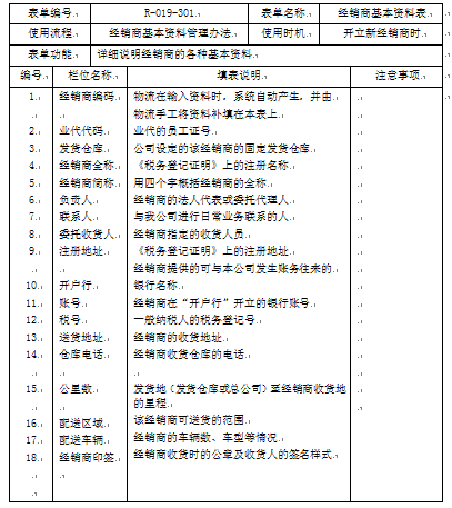 ② 填写《经销商基本资料表》:各营业所增加新的经销商时,组长填写《经销商基本资料表》,若为需要铁路运输的经销商开户,组长还要向所长提交《铁运基本资料表》。填表时请参看《经销商基本资料表》填写说明书。