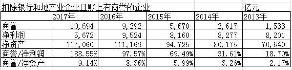 如果考虑把没有商誉的企业剔除,把金融业剔除,那么数据就会触目惊心。这些企业截至2017年上半年度商誉达到10,694亿元,占净资产的比例高达9.14%。而与净利润相比,2016年与2017年几乎持平,即实现的净利润刚好等于商誉余额。一旦发生大规模商誉减值,企业盈利会受到非常大的影响。如表5-2所示。
