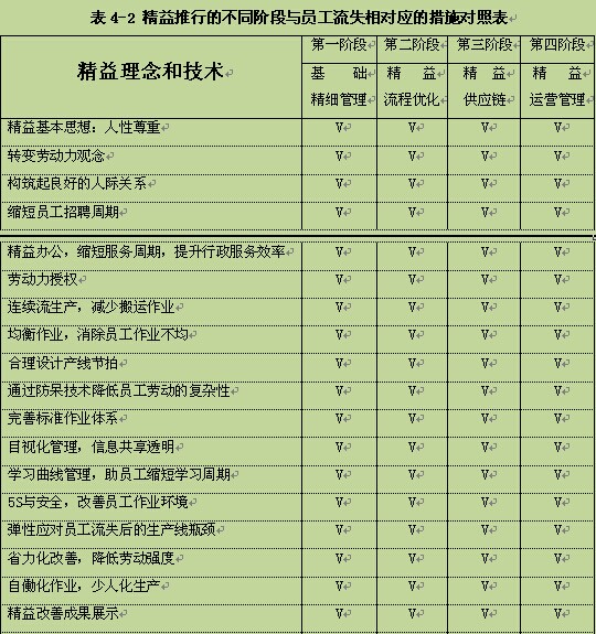 在精益推行的不同阶段,与员工流失相关的精益应对管理亦有选择和侧重地应用,如表4-2所示。