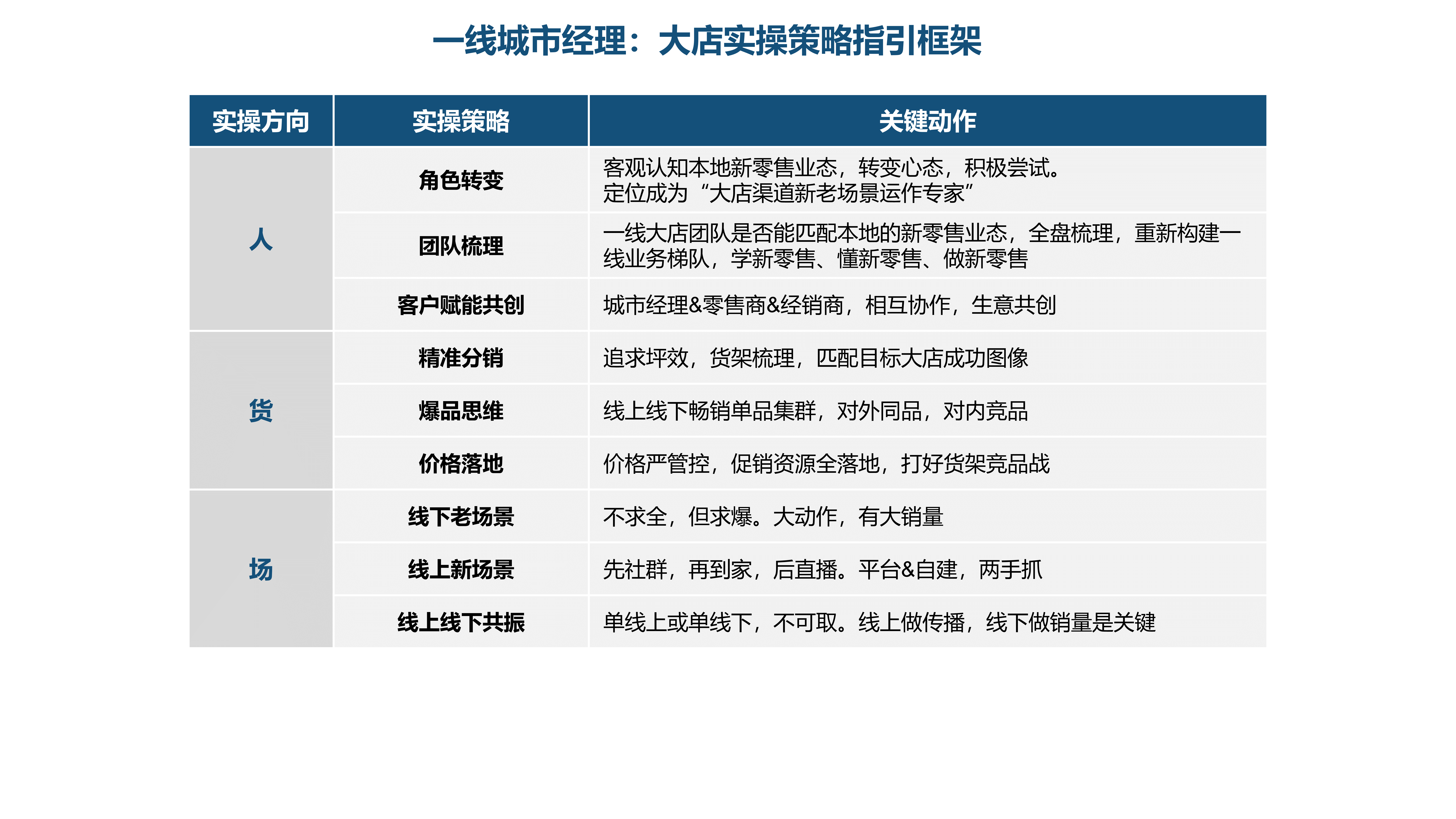 这里的“人”不是消费者,而是城市经理及团队自身。转变角色,客观看待大店的渠道升级,从转变管理者思想与心态开始,改变以往办公室远程指挥的方式,积极尝试投入到新老零售的学习。