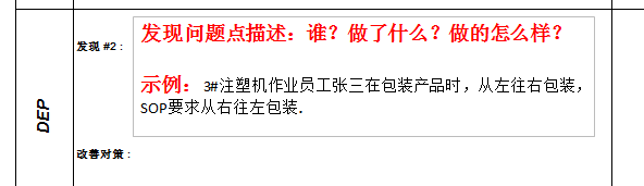 写评价发现时,要围绕谁、做了什么、做得怎么样三个点来描述。 例如:3#注塑机作业员工张三在包装产品时,从左往右包装,SOP要求从右往左包装,如图3-2所示。