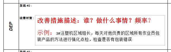 回复改善措施要围绕谁、做什么事情、频率三个点来描述。例如:3#注塑机区域组长每天对他负责的区域所有作业员包装产品的方法进行强化点检,检查是否有包装错误,如图3-5所示。