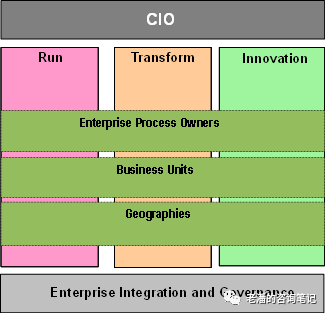 CIO纵向管理“Run”、“Transform”、“Innovation”, Run即信息化平台的基本运行维护,确保业务支持不中断;Transform是按照客户、供应链、员工发展等几条典型端到端流程配置的对口协调推动员;Innovation是在转型过程中技术创新的团队,这个团队逐步演变为数据应用团队。CIO横向矩阵交差管理或联动各流程所有者、业务单元leader、各地域区域leader。