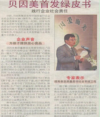 发布会邀请全国青少年食品安全行动委员会等相关政府部门、专家参加,还邀请了由贝因美赞助的4名聋哑儿童参加,并和贝因美代表一起按下贝因美企业社会责任报告绿皮书的手模。国家发改委公众营养与发展中心主任、全国青少年食品安全行动专家委员会副主任委员于小冬教授发言,提认为高食品质量是一项社会系统工程,需要发挥政府支持、监管到位、企业自律和舆论监督的综合效应,贝因美集团发布企业社会责任绿皮书,对食品行业尤其是婴童行业具有重大示范意义。
