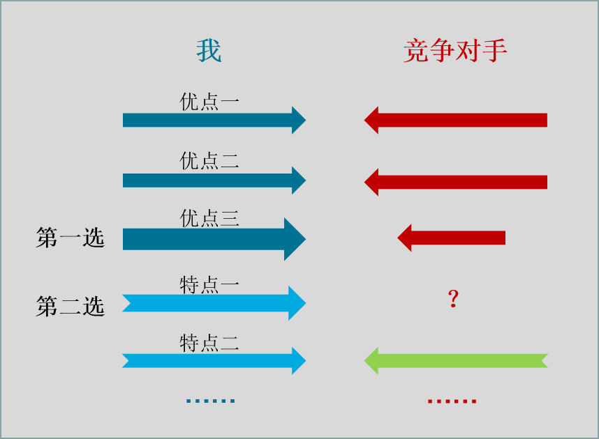 在USP策略实际应用中,我们一般是做一个列表(见图1-1),写明产品或公司的优点和特点,然后与最主要的竞争对手对标,选择明显优于竞争对手的卖点,或者我有人无的特点,作为商业文案创作的核心主题并进行延展应用。如果竞争对手已经诉求了这个“点”并形成了较为广泛、牢固的用户认知,我们可以用上述两种策略避其锋芒。另外,竞争对手未广泛宣传的、习以为常的行业标准及惯例也可列为USP点。