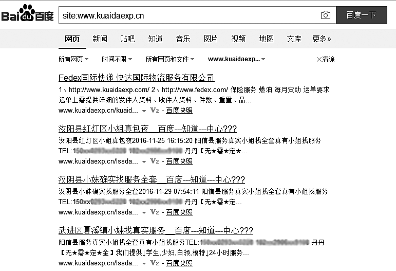 北京快达物流公司的网站总是被莫名地塞进了许多涉黄信息,如图2-10所示,不但公司声誉受到损伤,就连辛苦多年做的网站自然排名也全部掉没了。一开始公司还以为是有人盗取了网站空间管理的密码,但多次删除非法内容并变更密码后,过一段时间又被塞进这些信息。多次与网站空间服务商沟通无果后,换了家正规服务商后问题才得到解决。不要以为换服务商很简单,不但要做技术转换,还要重新备案,备案期间网站要被关闭半个月。前后折腾了半年,公司的网络营销工作受到很大影响。这个案例警示我们,虽然网站空间成本很低,一年只有几百元,但如果服务商的防火墙技术水平低,会让你损失惨重,所以从一开始就需要找一家正规的服务商。