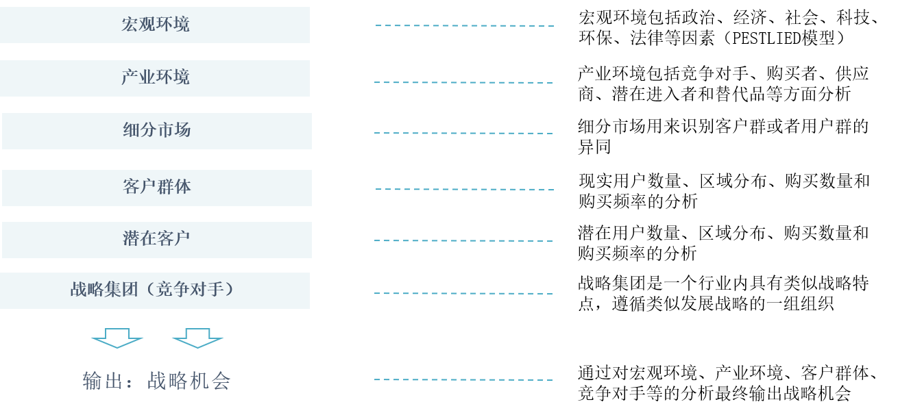 通常来说,市场洞察可以采用两种顺序:从内到外或者从外到内。习惯上采用从外到内的顺序,先分析宏观环境,再分析产业环境,然后是客户群体、接着是合作伙伴,最后是战略集团(直接竞争对手)和企业自身。按照这种顺序分析,可以看到宏观环境和影响产业、进而影响企业的传导路径。