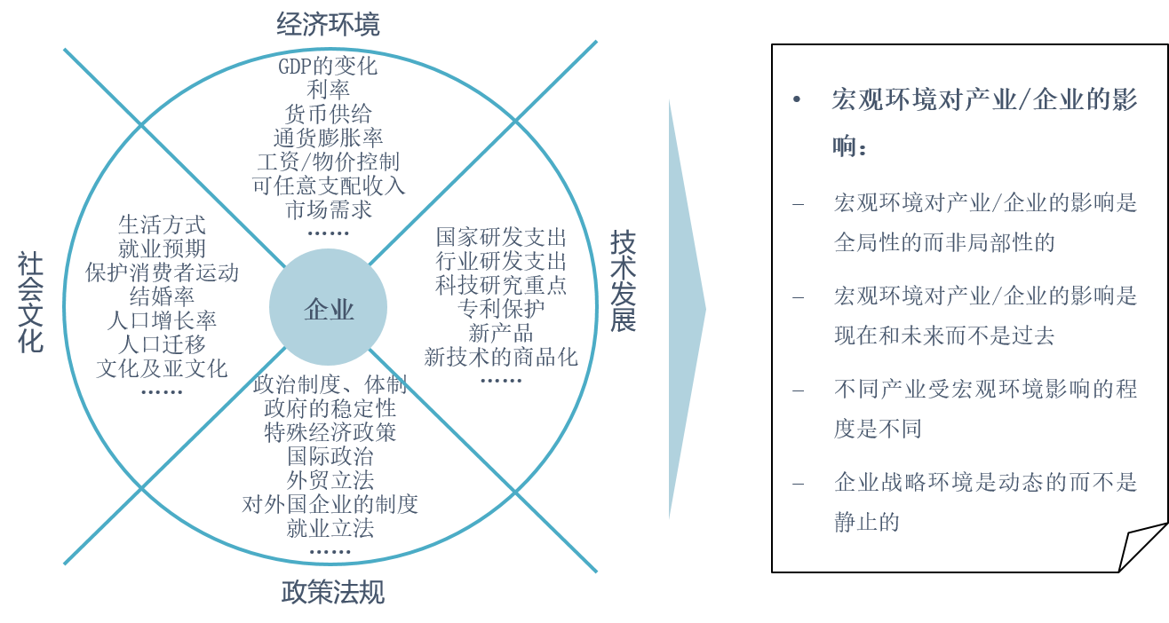 宏观环境的目的是要分析政策法规、宏观经济、社会文化、技术发展以及其他因素的变化趋势对行业的影响(最初是经典PEST框架,如图8-2所示,后来不断进入新的元素,这个框架变得更加全面)。宏观环境分析切忌面面俱到,而是要根据具体的产业,识别关键影响因素及其影响。例如共享经济(如共享单车),其关键影响因素是政策方面,而消费行业(如化妆品),关键影响是社会方面,人口的增长及消费升级对行业影响深远。