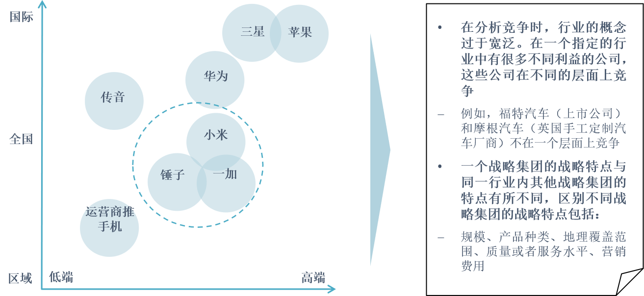 战略集团是一个行业内执行同样或者类似战略并具有类似战略特征的一组企业(如图8-3所示),战略集团分析是为了找到谁是最直接的竞争对手,以及在每个战略集团内部,竞争最有可能在什么基础上展开。一个产业往往有几个战略集团,战略集团分析介于行业格局分析和单体企业竞争分析之间,能够帮助把握行业中真正面临的竞争方向及其竞争实质,以及发现新的战略机会。