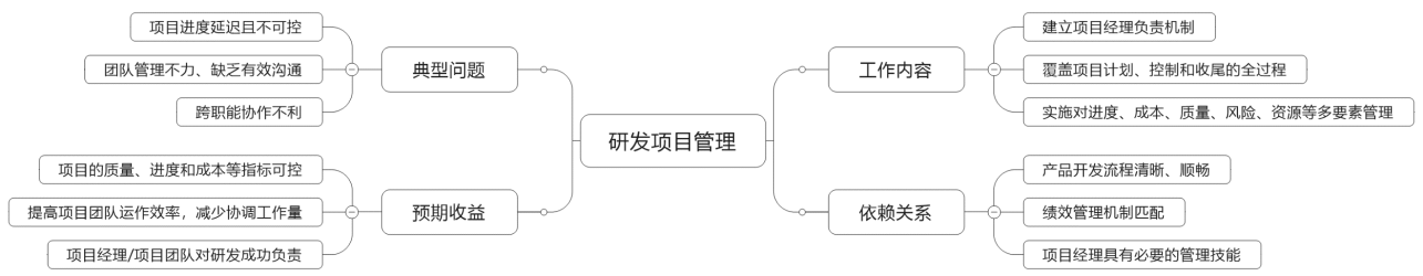 改进项目管理机制,目的是让研发项目运作顺畅、协调,提高整体效率。对于不同的企业,项目管理领域的问题不能一概而论,比如研发资源匮乏、项目目标不明确且中途变更、对项目缺乏绩效激励措施、项目管理能力/技术实现能力相对不足等,这些问题往往交织在一起,对改进工作提出了较高要求。